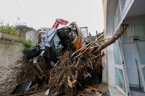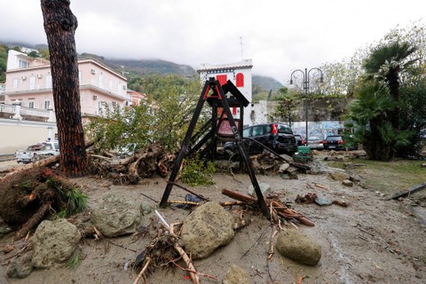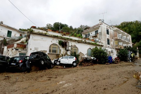 Mobil-mobil terdampar dan lumpur menyapu jalanan usai tanah longsor melanda di pulau Ischia, Italia, pada Sabtu (26/11).