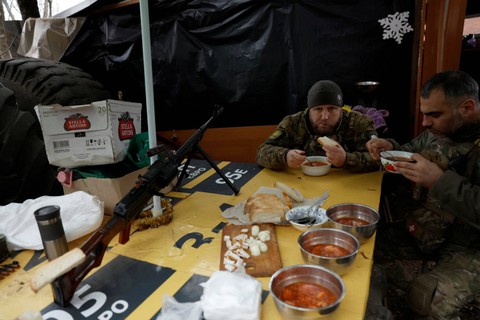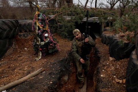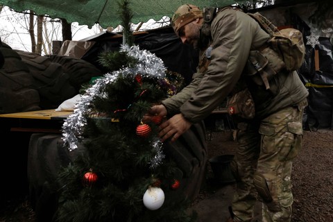 Sejumlah prajurit Ukraina dari resimen Polisi Patroli Tugas Khusus Dnipro-1 merayakan Natal di Bakhmut, Ukraina, Sabtu (24/12). Foto: Clodagh Kilcoyne/ReutersMereka merayakan Natal di garis depan pertempuran. Foto: Clodagh Kilcoyne/ReutersMereka menghias pohon Natal sederhana dan diletakkan di parit yang jadi tempat persembunyian mereka melawan tentara Rusia. Foto: Clodagh Kilcoyne/ReutersMereka juga terpaksa merayakan Natal jauh dari keluarga mereka. Foto: Clodagh Kilcoyne/ReutersPara prajurit tersebut juga tampak masak dan makan bersama di barak. Foto: Clodagh Kilcoyne/Reuters