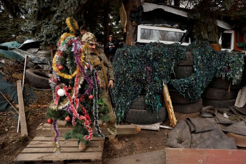 Prajurit Ukraina membawa pohon Natal yang dihias ke parit di garis depan pertahanan Ukraina pada Malam Natal di Bakhmut, Sabtu (24/12/2022). Foto: Clodagh Kilcoyne/Reuters