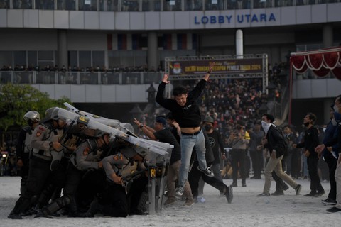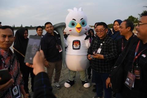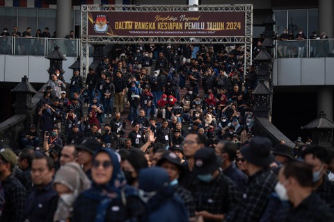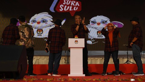 Ketua Komisi Pemilihan Umum (KPU) Hasyim Asy'ari (tengah) didampingi Anggota DKPP Muhammad Tio Aliansyah (keempat kiri) dan para anggota KPU meluncurkan maskot dan jingle Pemilu 2024 di Ancol, Jakarta Utara, Jumat (2/12). Foto: Sigid Kurniawan/ANTARA FOTOKPU secara resmi meluncurkan maskot Pemilu 2024 dengan nama "Sura dan Sulu". Foto: Sigid Kurniawan/ANTARA FOTOSelain itu, KPU juga meluncurkan jingle Pemilu 2024 berjudul Memilih untuk Indonesia yang dibawakan oleh grup musik Cokelat. Foto: Sigid Kurniawan/ANTARA FOTOAnggota Polisi berlindung dengan tameng dalam simulasi pengamanan Pemilu disela peluncuran maskot dan jingle Pemilu 2024 di Ancol, Jakarta Utara, Jumat (2/12). Foto: Sigid Kurniawan/ANTARA FOTOKPU secara resmi meluncurkan maskot Pemilu 2024 dengan nama "Sura dan Sulu". Foto: Sigid Kurniawan/ANTARA FOTOSelain itu, KPU juga meluncurkan jingle Pemilu 2024 berjudul Memilih untuk Indonesia yang dibawakan oleh grup musik Cokelat. Foto: Sigid Kurniawan/ANTARA FOTOAnggota Komisi Pemilihan Umum (KPU) Daerah mengikuti peluncuran maskot dan jingle Pemilu 2024 di Ancol, Jakarta Utara, Jumat (2/12). Foto: Sigid Kurniawan/ANTARA FOTOSejumlah anggota KPU Daerah berfoto dengan maskot Pemilu 2024 saat diluncurkan di Ancol, Jakarta Utara, Jumat (2/12). Foto: Sigid Kurniawan/ANTARA FOTOWarga dengan memakai kostum maskot Pemilu 2024 Sura dan Sulu berpose usai peluncurannya di Ancol, Jakarta Utara, Jumat (2/12). Foto: Sigid Kurniawan/ANTARA FOTO