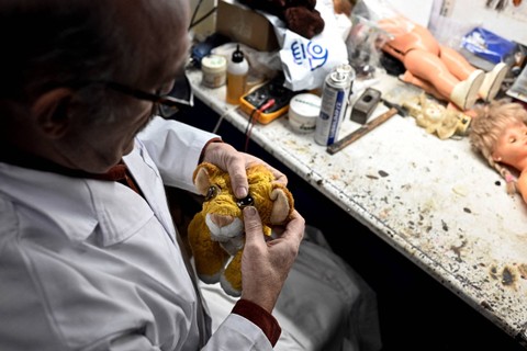 Antonio Martinez Rivas memperbaiki boneka "Lion King" di bengkelnya "Hospital del Juguete" (Rumah sakit mainan), di Madrid pada 20 Desember 2022. Foto: Oscar Del Pozo/AFP