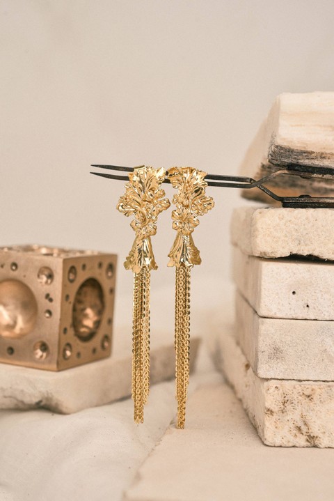Seluruh koleksi Emiria dari Tulola Jewelry ini dikerjakan dengan tangan alias handmade menggunakan bahan 92,5 persen perak murni dengan pelapisan emas 18 karat. Proses ini memakan waktu seminggu setiap item-nya, dengan teknik gergajian, tatahan, dibentuk, dirangkai dengan patri.