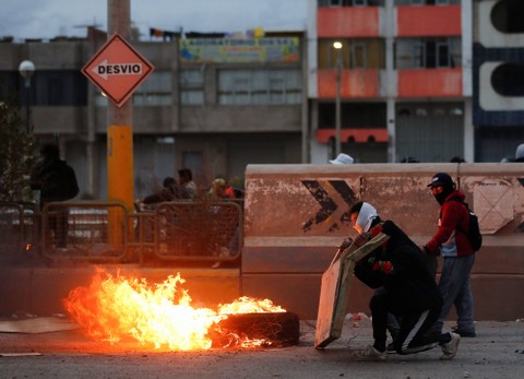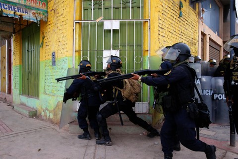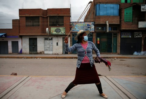 Seorang demonstran wanita menggunakan ketapel untuk melemparkan batu selama protes menuntut pemilihan awal dan pembebasan pemimpin terguling Peru Pedro Castillo, di Juliaca, Peru 8 Januari 2023. Foto: Hugo Courotto/ReutersProtes anti-pemerintah yang penuh kekerasan di Peru tenggara menyebabkan lebih dari 60 orang terluka dalam beberapa hari terakhir ketika bentrokan antara polisi dan pengunjuk rasa berlanjut di dekat bandara Juliaca di wilayah Puno. Foto: Hugo Courotto/ReutersMenurut Kementerian Kesehatan Peru, 67 orang dirawat di rumah sakit setelah bentrokan dalam demonstrasi antara Rabu (4 Januari) dan Sabtu (7 Januari). Foto: Hugo Courotto/ReutersLusinan pengunjuk rasa berusaha mengambil alih bandara dekat perbatasan Peru dengan Bolivia pada Sabtu sebagai bagian dari protes anti-pemerintah, mendorong polisi menggunakan gas air mata untuk membubarkan mereka. Foto: Hugo Courotto/ReutersAndean Airports of Peru, yang mengoperasikan bandara Juliaca, mengatakan layanan dihentikan pada Sabtu "karena tindakan kekerasan dan kurangnya keamanan." Foto: Hugo Courotto/ReutersProtes terhadap Presiden Dina Boluarte dilanjutkan minggu ini setelah jeda dua minggu, menyusul bentrokan kekerasan pada bulan Desember yang menewaskan 22 orang setelah pencopotan dan penangkapan mantan Presiden Pedro Castillo. Foto: Luis Javier/Reuters
