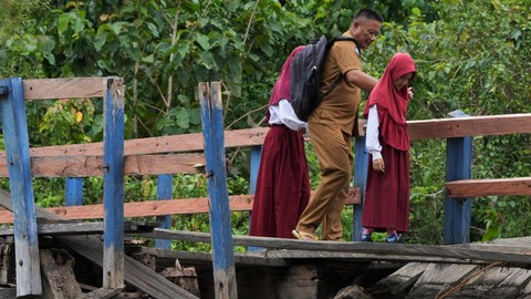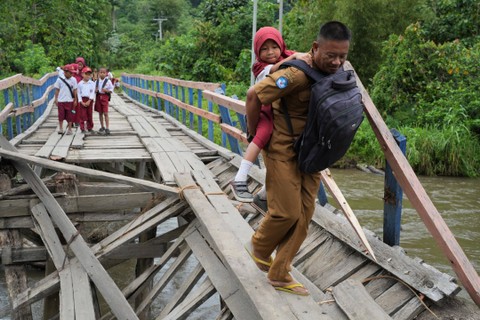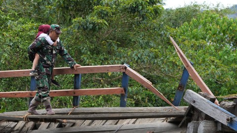 Seorang guru bersama Babinsa TNI AD membantu sejumlah siswa SD Negeri 1 Alaaha saat menyeberangi jembatan rusak di Desa Alaaha, Kecamatan Ueesai, Kolaka Timur, Sulawesi Tenggara, Sabtu (21/1). Foto: Jojon/Antara FotoJembatan yang menjadi akses satu-satunya dan penghubung tiga desa tersebut. Foto: Jojon/Antara FotoJembatan tersebut rusak akibat lapuk serta dorongan arus deras sungai Wandolaki. Foto: Jojon/Antara FotoRusaknya jembatan tersebut membuat sekitar 1.850 jiwa di wilayah itu tidak bisa beraktivitas normal. Foto: Jojon/Antara Foto