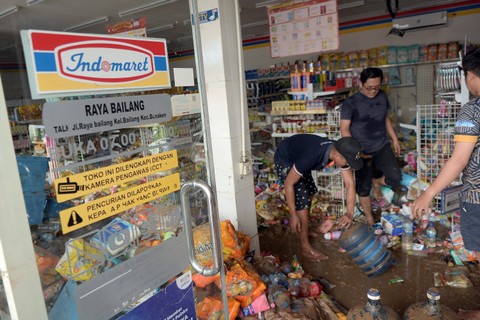 Sejumlah warga membersihkan toko miliknya usai banjir di Kelurahan Bailang, Manado, Sulawesi Utara, Sabtu (28/1/2023). Foto: Adwit B Pramono/ANTARA FOTO