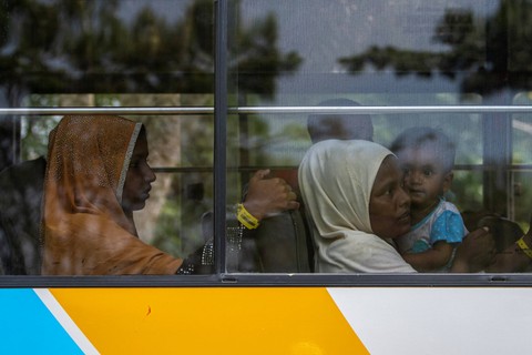 Imigran etnis Rohingya berjalan menuju bus untuk direlokasi di lokasi penampungan sementara, SMP Negeri 2 Curei, Gampong Curei, Kecamatan Muara Tiga, Kabupaten Pidie, Aceh, Minggu (1/1/2023). Foto: Nova Wahyudi/ANTARA FOTO