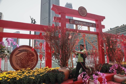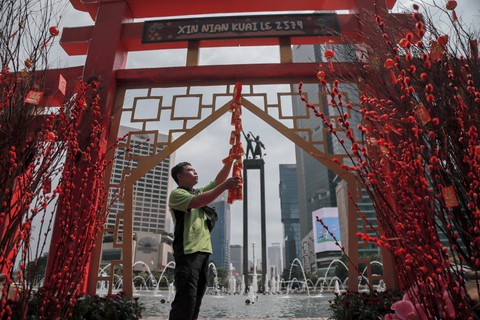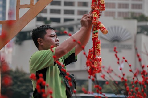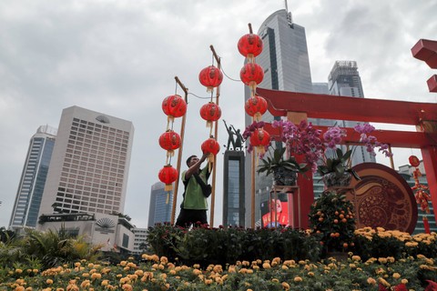 Petugas dari Dinas Taman Kota dan Kehutanan menata ornamen khas Tionghoa di Bundaran HI, Jakarta, Sabtu (21/1/2023). Foto: Jamal Ramadhan/kumparan