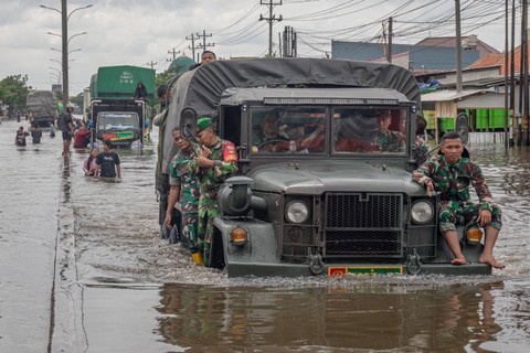 Personel TNI-Polri dan tim kesehatan melakukan patroli dengan perahu karet untuk mengevakuasi warga yang terisolir banjir yang merendam Jalur Pantura Kaligawe-Genuk, Semarang, Jawa Tengah, Senin (2/1/2023). Foto: Aji Styawan/ANTARA FOTO