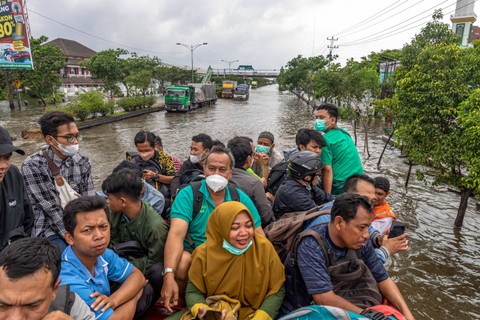 BPBD Semarang hingga TNI-Polri membantu mengevakuasi warga terdampak banjir di Jalur Pantura Kaligawe-Genuk, Semarang, Jawa Tengah, Senin (2/1). Foto: Aji Styawan/ANTARA FOTOSejumlah armada seperti truk, kendaraan luar jalan (off road), perahu karet dari BPBD Kota Semarang, TNI-Polri serta sejumlah komunitas relawan disiagakan untuk mengevakuasi warga terdampak banjir. Foto: Aji Styawan/ANTARA FOTOWarga lanjut usia wanita, anak-anak, karyawan serta pasien rumah sakit yang terisolir banjir menjadi prioritas dalam evakuasi tersebut. Foto: Aji Styawan/ANTARA FOTOFoto: Aji Styawan/ANTARA FOTO