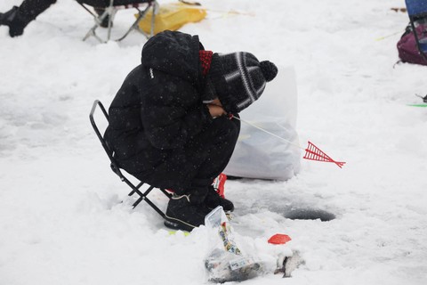 Mereka memancing ikan trout di sekitar danau yang membeku saat musim dingin.