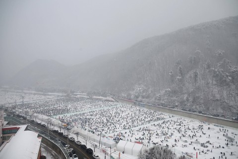 Ribuan orang mengunjungi danau beku saat Festival Es Hwacheon di Korea Selatan, Sabtu (7/1).