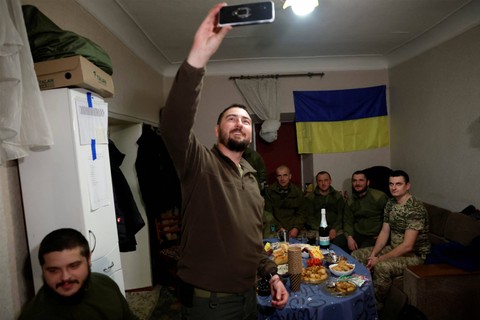 Tentara Ukraina merayakan momen tahun baru di barak tempat mereka tinggal di wilayah Donetsk, Ukraina, Sabtu (31/12/2022).