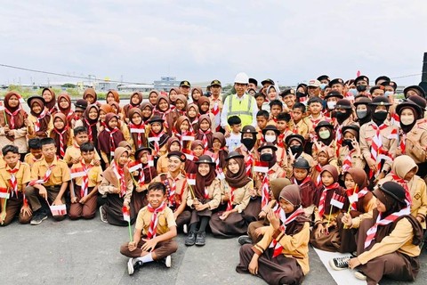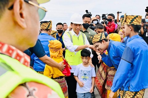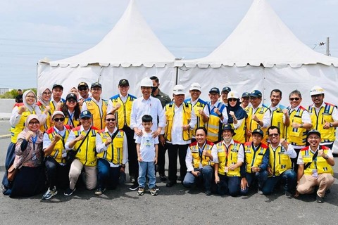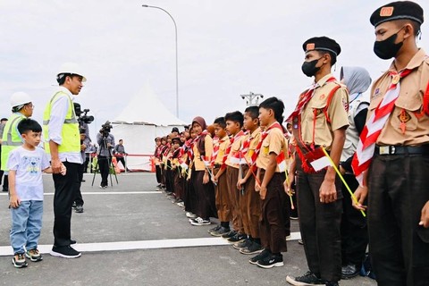 Presiden Jokowi mengajak cucunya, Jan Ethes, saat meresmikan Jalan Tol Semarang-Demak Seksi II di Gerbang Tol Sayung, Kabupaten Demak, Jawa Tengah, Sabtu (25/2).