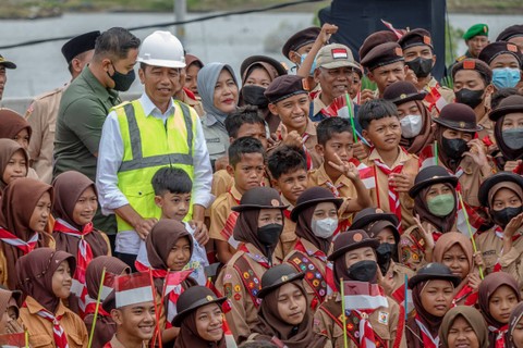 Presiden Jokowi (tengah) bersama Menteri PUPR Basuki Hadimuljono (kiri) dan cucunya Jan Ethes berjalan menuju lokasi peresmian Jalan Tol Semarang-Demak Seksi II di Gerbang Tol Sayung, Kabupaten Demak, Jawa Tengah, Sabtu (25/2/2023). Foto: Aji Styawan/ANTARA FOTO