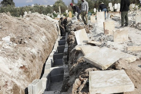 Relawan menyiapkan kuburan untuk para korban, setelah gempa mematikan, di kota Jandaris yang dikuasai pemberontak, Suriah, Jumat (10/2/2023). Foto: Mahmoud Hassano/REUTERS