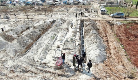 Di sebuah pemakaman di kota Jandaris yang dilanda gempa di Suriah, para sukarelawan menggali kuburan massal pada hari Jumat (10/2) untuk para korban tanpa identitas.