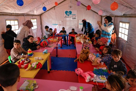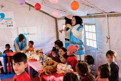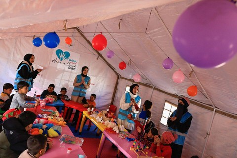 Balon warna-warni digantung di atas tenda di sebuah kamp kemanusiaan di Adiyaman, Turki, di mana sejumlah anak korban selamat gempa bernyanyi dan bermain bersama para relawan.