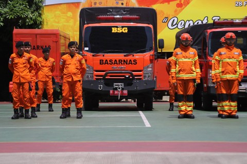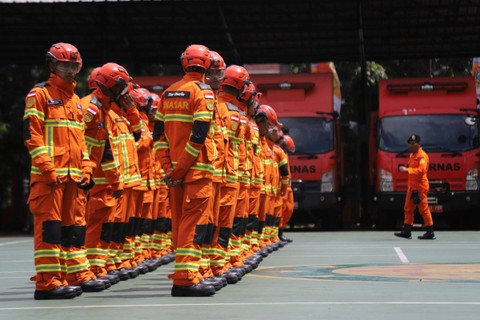 Upacara persiapan pelepasan pengerahan tim Inasar dalam rangka perbantuan internasional ke Turki di Lapangan Basarnas, Kantor Pusat Basarnas, Kemayoran, Jakarta, Jumat (10/2/2023).