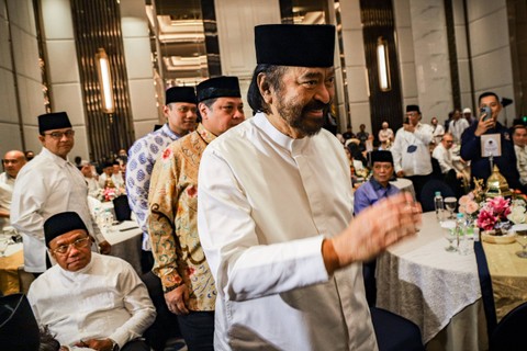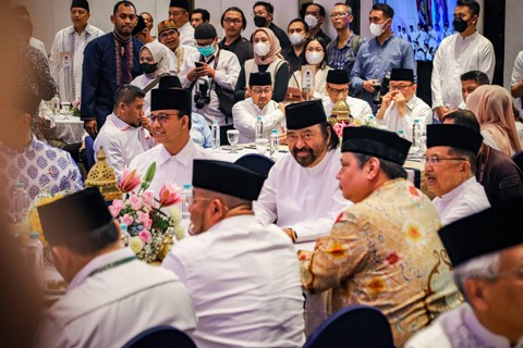 Pantauan kumparan di lokasi, Ketum NasDem, Surya Paloh, memasuki ruangan bukber sekitar pukul 17.23 WIB. Ia didampingi Anies, Ketum Golkar, Airlangga Hartarto, hingga Ketum Demokrat, Agus Harimurti Yudhoyono (AHY).