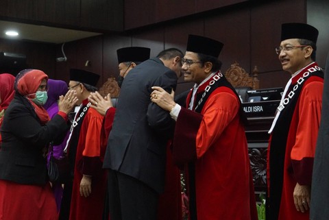 Setelah Anwar, giliran Saldi Isra yang disumpah sebagai Wakil Ketua MK. Pengambilan sumpah dilakukan menurut ajaran Islam. Sama seperti Anwar, Saldi Isra langsung menandatangi berita acara dengan diikuti 8 hakim MK lainnya.
