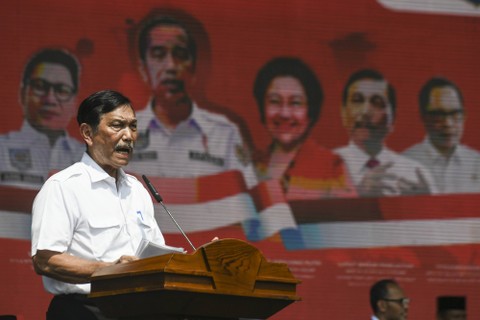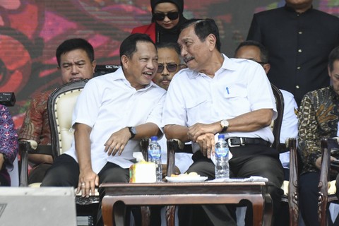 Ketua BPIP Megawati Soekarnoputri bersama Menko Marves Luhut Binsar Pandjaitan, Mendagri Tito Karnavian, dan Gubernur Jawa Timur Khofifah Indar Parawansa menghadiri HUT ke-9 UU Desa di kawasan Gelora Bung Karno, Jakarta, Minggu (19/3/2023). Foto: Hafidz Mubarak A/ANTARA FOTO