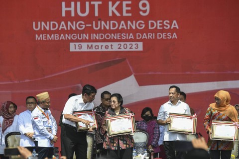 Peringatan HUT ke-9 UU Desa digelar di kawasan Gelora Bung Karno, Jakarta, Minggu (19/3). Acara ini dihadiri oleh sejumlah elite politik. Foto: Hafidz Mubarak A/ANTARA FOTOPantauan kumparan, Mendagri sekaligus Ketua Dewan Pembina APDESI Tito Karnavian, Gubernur Jawa Timur Khofifah, Menko Marves Luhut Binsar Panjaitan, hingga Ketua BPIP Megawati Soekarno Putri menghadiri acara tersebut. Foto: Hafidz Mubarak A/ANTARA FOTOPeringatan 9 tahun Undang-Undang Desa ini ditujukan untuk menyampaikan 6 poin usulan kepada pemerintah. Di antaranya adalah meminta alokasi 10 persen APBN untuk pembangunan desa. Foto: Hafidz Mubarak A/ANTARA FOTOSejauh ini pemerintah pusat mengalokasikan anggaran dana desa sebesar Rp 468,6 triliun dari APBN 2014-2022. Foto: Hafidz Mubarak A/ANTARA FOTOAcara ini diikuti ribuan perangkat desa dari seluruh Indonesia. Karenanya, Rekor MURI pun menganugerahi acara ini dengan kategori peserta terbanyak 100.000 peserta yang terdiri atas Kepala Desa, BPD dan Perangkat Desa. Foto: Hafidz Mubarak A/ANTARA FOTO