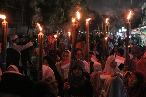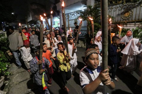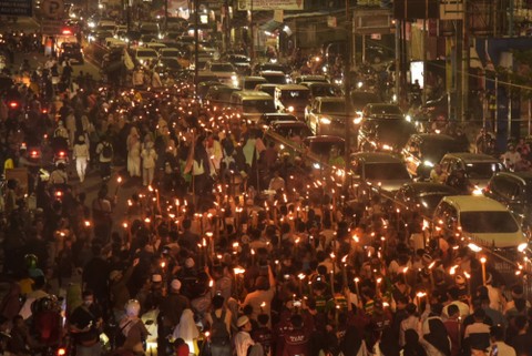 Sejumlah warga di beberapa daerah menggelar pawai obor sambil Sabtu (18/3). Umat Islam mulai melakukan tradisi pawai obor seperti di Jakarta, Bogor, Medan hingga Palu.