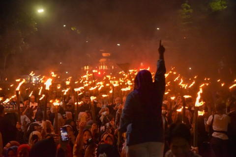 Warga mengikuti pawai obor di Jalan Raya Puncak, Kabupaten Bogor, Jawa Barat, Sabtu (18/3/2023). Foto: Yulius Satria Wijaya/Antara Foto