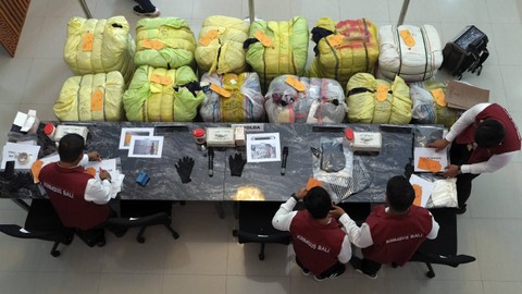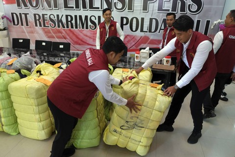 Anggota polisi menata barang bukti saat konferensi pers hasil penyidikan pakaian bekas impor yang ada di Bali di Mapolda Bali, Denpasar, Bali, Senin (20/3/2023). Foto: ANTARA FOTO/Nyoman Hendra WibowoDirektorat Reserse Kriminal Khusus (Ditreskrimsus) Polda Bali menangkap dua tersangka berinisial J selaku penjual pakaian bekas dan inisial B selaku pembeli pakaian bekas. Foto: ANTARA FOTO/Nyoman Hendra WibowoPolisi juga mengamankan barang bukti yang disita berupa pakaian bekas impor sebanyak 117 bal dan uang sebesar Rp 20 juta. Foto: Kemendag RIKapolda Bali Irjen Pol Putu Jayan Danu Putra (tengah) bersama Kepala Kanwil Bea dan Cukai Bali, NTB dan NTT Susila Brata (kedua kanan), Kepala Dinas Perindag Provinsi Bali I Wayan Jarta (kanan), Direktur Reserse Kriminal Khusus (Dirreskrimsus) Polda Bali Kombes Pol Roy Hutton Marulamrata Sihombing (kedua kiri), dan Kabid Humas Polda Bali Kombes Pol Stefanus Satake Bayu Setianto (kiri) menunjukkan barang bukti saat konferensi pers hasil penyidikan pakaian bekas impor yang ada di Bali di Mapolda Bali, Denpasar, Bali, Senin (20/3/2023). Foto: ANTARA FOTO/Nyoman Hendra Wibowo