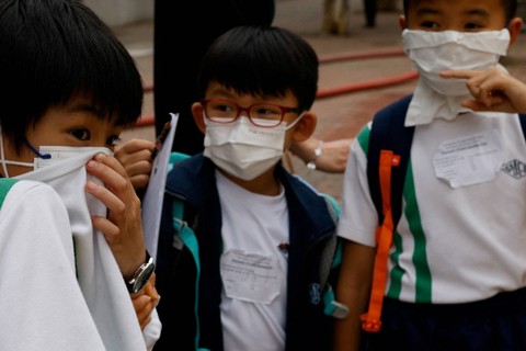 Orang-orang menutupi hidung mereka saat kepulan asap terlihat di sebuah gudang yang terbakar, di distrik Kowloon yang ramai di kota itu, di Hong Kong, China, Jumat (24/3/2023). Foto: Tyrone Siu/REUTERS