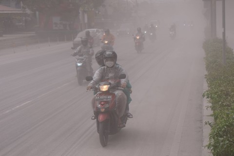 Sejumlah kendaraan melintas di jalan utama kota Magelang yang diselimuti abu vulkanik gunung Merapi di Magelang, Jawa Tengah, Sabtu (11/3). Foto: Anis Efizudin/ANTARA FOTOGunung Merapi kembali erupsi dan memuntahkan awan panas guguran (APG) pada pukul 12.12 WIB, yang mengakibatkan hujan abu yang mengarah ke barat laut dan utara. Foto: Anis Efizudin/ANTARA FOTOKepala Badan Geologi, Sugeng Mujiyanto mengatakan, dampak hujan abu terparah akan terasa di Magelang, Jawa Tengah. Foto: Anis Efizudin/ANTARA FOTOSaat ini status Gunung Merapi tidak berubah, masih tetap Level III atau Siaga. Foto: Anis Efizudin/ANTARA FOTOFoto: Anis Efizudin/ANTARA FOTO