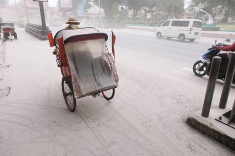 Sebuah becak melintas di jalan utama kota Magelang yang diselimuti abu vulkanik gunung Merapi di Magelang, Jawa Tengah, Sabtu (11/3/2023). Foto: Anis Efizudin/ANTARA FOTO