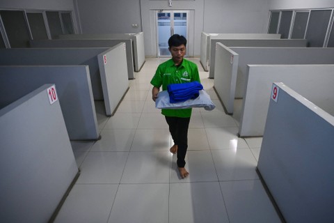 Karyawan membawakan kasur untuk pemudik yang beristirahat di bilik istirahat Rest Area KM 57, Tol Jakarta-Cikampek, Karawang, Jawa Barat, Minggu (16/4/2023). Foto: Aditya Pradana Putra/Antara Foto