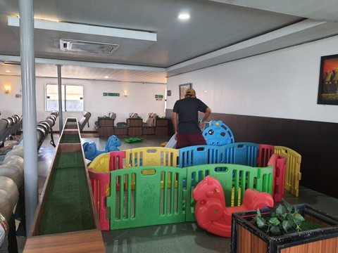 Selama di perjalanan penumpang bisa memanfaatkan beberapa fasilitas, dan beristirahat di dalam kapal. Terdapat bangku yang cukup nyaman hingga tempat bermain khusus anak.