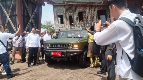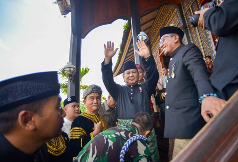 Menteri Pertahanan Prabowo Subianto mengunjungi Istana Basa Pagaruyung di Batusangkar, Kabupaten Tanah Datar, Sumatera Barat, Sabtu (29/4). Foto: Dok. IstimewaPrabowo terlihat menyopiri Afriansyah Noor dari Istana Silindung Bulan menuju Istana Basa Pagaruyung tempat pengukuhan gelar adat dilangsungkan Foto: Dok. IstimewaKunjungan Prabowo ke replika istana kerajaan Pagaruyung itu dalam rangka menyaksikan pengukuhan gelar adat kepada Wakil Menteri Ketenagakerjaan Afriansyah Noor. Foto: Iggoy el Fitra/ANTARA FOTOPrabowo terlihat mengenakan pakaian adat. Foto: Iggoy el Fitra/ANTARA FOTOSesampainya di Istana Basa Pagaruyung, rombongan disambut dengan tarian dan atraksi khas Minangkabau. Foto: Iggoy el Fitra/ANTARA FOTOSelanjutnya, para Ninik Mamak telah menanti rombongan di dalam Istana Basa Pagaruyung. Foto: Iggoy el Fitra/ANTARA FOTO