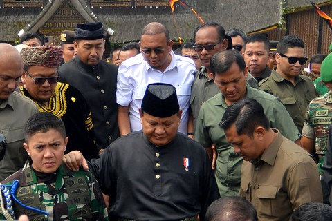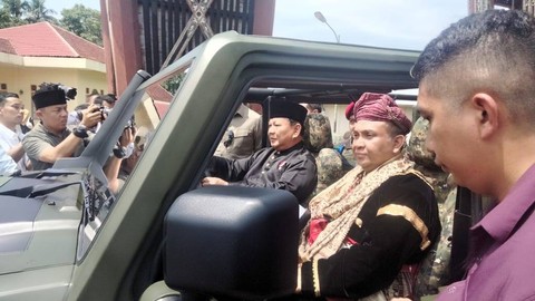 Kunjungan Prabowo ke replika istana kerajaan Pagaruyung itu dalam rangka menyaksikan pengukuhan gelar adat kepada Wakil Menteri Ketenagakerjaan Afriansyah Noor.
