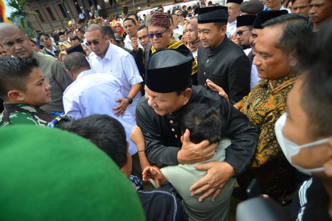 Menteri Pertahanan Prabowo Subianto (tengah) menyapa warga saat mengunjungi Istana Basa Pagaruyung di Batusangkar, Kabupaten Tanah Datar, Sumatera Barat, Sabtu (29/4/2023). Foto: Iggoy el Fitra/ANTARA FOTO