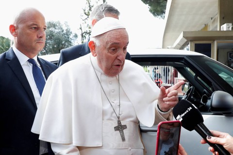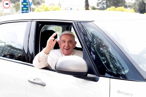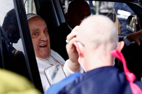Paus Fransiskus melambaikan tangan dari mobil saat meninggalkan rumah sakit Gemelli Roma di Roma, Italia, Sabtu (1/4/2023). Foto: Remo Casilli/REUTERS