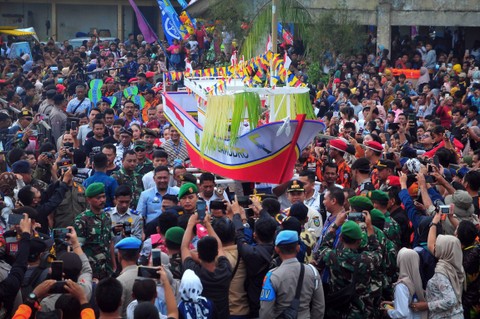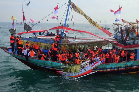 Warga melepas miniatur kapal yang berisi sesajen saat prosesi tradisi Pesta Lomban di perairan laut Jepara, Jepara, Jawa Tengah, Sabtu (29/4). Foto: Yusuf Nugroho/ANTARA FOTOPesta Lomban yang diikuti kurang lebih 200 kapal nelayan yang diadakan sepekan setelah Hari Raya Idul Fitri. Foto: Yusuf Nugroho/ANTARA FOTOTradisi ini dilakukan dengan melarung sesajen berupa kepala kerbau serta hasil bumi ke tengah laut. Foto: Yusuf Nugroho/ANTARA FOTOItu dilakukan sebagai bentuk ungkapan syukur kepada Tuhan Yang Maha Esa atas tangkapan ikan yang melimpah serta keselamatan saat melaut. Foto: Yusuf Nugroho/ANTARA FOTO
