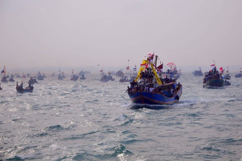 Warga mengikuti prosesi tradisi Pesta Lomban di perairan laut Jepara, Jepara, Jawa Tengah, Sabtu (29/4/2023). Foto: Yusuf Nugroho/ANTARA FOTO