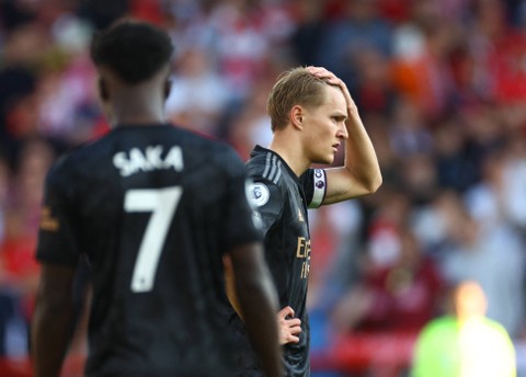Arsenal kalah saat melawan Nottingham Forest dalam pertandingan pekan ke-37 Liga Inggris 2022/23, Sabtu (20/5). Foto: Carl Recine/ReutersKekalahan tersebut membuat Manchester City memastikan lolos sebagai juara musim ini. Foto: Carl Recine/ReutersThe Gunners kalah 0-1 di Stadion City Ground, Nottinghamshire, Inggris. Foto: Carl Recine/ReutersNottingham Forest sebagai tuan rumah sukses mencetak gol lebih dulu di menit 19. Foto: Carl Recine/ReutersMemanfaatkan kesalahan Odegaard saat melepas umpan. Bola jatuh ke kaki Gibbs-White dan langsung berlari ke depan lalu memberi through pass ke Awoniyi yang menyelesaikan dengan klinis. Foto: Carl Recine/Reuters