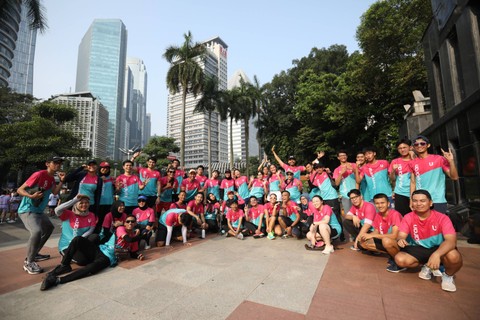 Teman kumparan dan awak kumparan mengikuti Fun Run teman kumparan melakukan foto bersama di Pintu 6 GBK pada Minggu (21/5/2023). Foto: Aditia Noviansyah/kumparan
