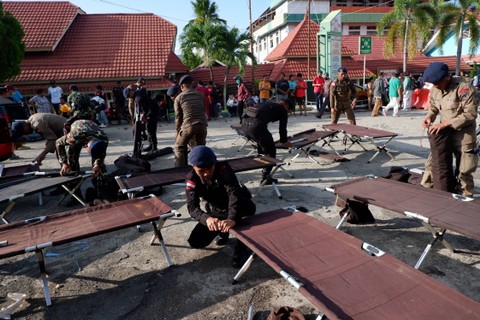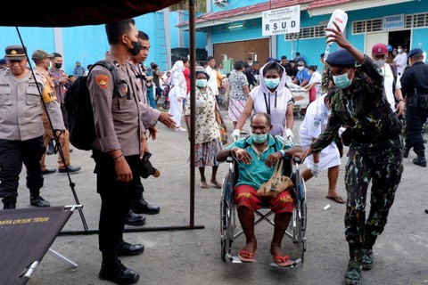 Sejumlah anggota Brimob mengevakuasi pasien ke tenda sementara saat kebakaran Instalasi Rawat Darurat (IRD) RSUD Abepura di Kota Jayapura, Papua, Selasa (9/5/2023). Foto: Gusti Tanati/ANTARA FOTO