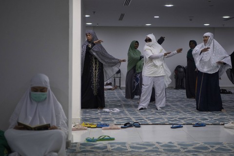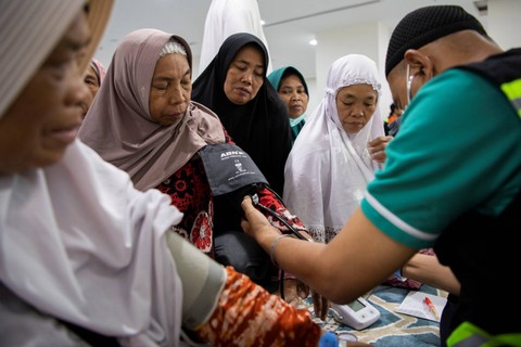 Sejumlah jemaah haji lansia kloter SOC 20 mengikuti senam di Hotel Bilal Sektor 10, Makkah, Arab Saudi, Sabtu (17/6). Foto: Wahyu Putro A/ANTARA FOTOSenam lansia yang diikuti puluhan jemaah tersebut untuk menjaga kesehatan dalam menghadapi puncak ibadah haji 1444 H/ 2023 Hijriah. Foto: Wahyu Putro A/ANTARA FOTOUsai mengikuti senam, para jemaah haji lansia juga mendapat pemeriksaan kesehatan dengan dicek tensi darah oleh tenaga kesehatan. Foto: Wahyu Putro A/ANTARA FOTOFoto: Wahyu Putro A/ANTARA FOTOFoto: Wahyu Putro A/ANTARA FOTO