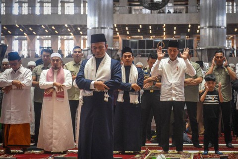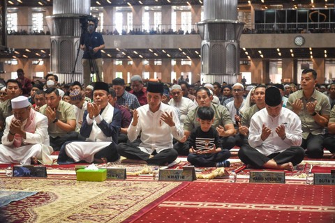 Presiden Joko Widodo bersama cucu pertamanya, Jan Ethes Srinarendra, melakukan salat Jumat berjemaah di Masjid Istiqlal, Jakarta, pada Jumat, 23 Juni 2023. Foto: Dok. BPMI SetpresDengan mengenakan kemeja putih lengan panjang, celana hitam, dan peci hitam, Presiden Jokowi dan cucunya tiba di tempat ibadah sekitar pukul 11.55 WIB. Foto: Dok. BPMI SetpresSetibanya di sana, Presiden langsung memasuki masjid dan menuju ke saf paling depan. Foto: Dok. BPMI SetpresTampak Presiden dan Jan Ethes duduk berdampingan menunggu azan dan ikamah salat Jumat berkumandang. Foto: Dok. BPMI SetpresUsai salat Jumat berjemaah, Presiden Jokowi beserta cucu keluar dari masjid dan kembali menuju ke Istana Kepresidenan, Jakarta pada pukul 12.40 WIB. Foto: Dok. BPMI Setpres
