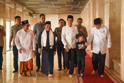 Presiden Jokowi bersama cucu pertamanya, Jan Ethes Srinarendra, melaksanakan salat Jumat berjemaah di Masjid Istiqlal, Jakarta, Jumat (23/6). Dengan mengenakan kemeja putih lengan panjang, celana hitam, dan peci hitam, Jokowi dan cucunya tiba di lokasi sekitar pukul 11.55 WIB.