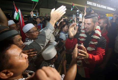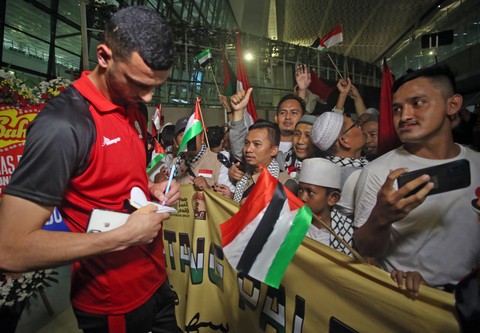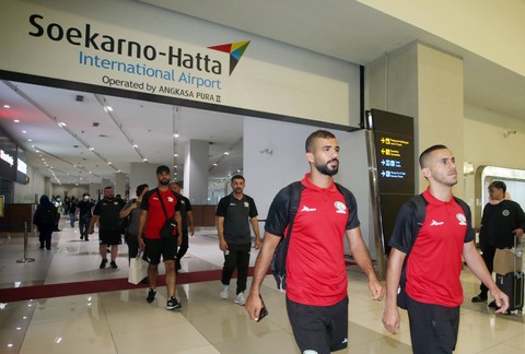 Sejumlah pendukung menyambut kedatangan pesepak bola Timnas Palestina setibanya di Terminal 3 Bandara Soekarno Hatta, Tangerang, Banten, Sabtu (10/6). Foto: Muhammad Iqbal/Antara FotoTimnas Palestina akan melakukan pertandingan persahabatan atau FIFA Matchday dengan Timnas Indonesia pada Rabu (14/6). Foto: Muhammad Iqbal/Antara FotoPertandingan tersebut akan digelar di Stadion Gelora Bung Tomo, Surabaya. Foto: Muhammad Iqbal/Antara FotoSejumlah pesepak bola Timnas Palestina tiba di Terminal 3 Bandara Soekarno Hatta, Tangerang, Banten, Sabtu (10/6/2023). Foto: Muhammad Iqbal/Antara Foto
