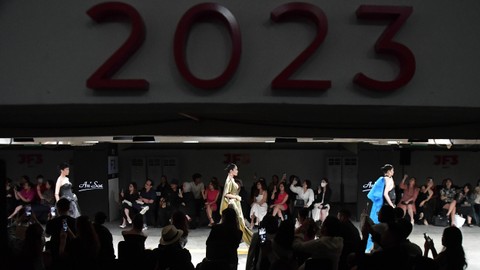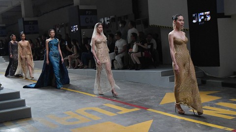 Sejumlah model memperagakan busana koleksi Ernesto Abram pada JF3 Fashion Festival di Summarecon Mall Kelapa Gading, Jakarta, Jumat (21/7/2023). Foto: ANTARA FOTO/ Fakhri HermansyahPutra Presiden Joko Widodo, Kaesang Pangarep (kedua kiri) menyaksikan JF3 Fashion Festival di Summarecon Mall Kelapa Gading, Jakarta, Jumat (21/7/2023). Foto: ANTARA FOTO/ Fakhri HermansyahKegiatan peragaan busana yang diadakan di area parkir tersebut untuk mempromosikan industri mode karya desainer Indonesia. Foto: ANTARA FOTO/ Fakhri HermansyahAcara tersebut berlangsung dari tanggal 21-26 Juli 2023. Foto: ANTARA FOTO/ Fakhri Hermansyah