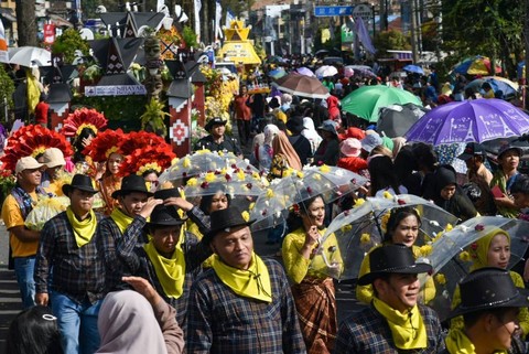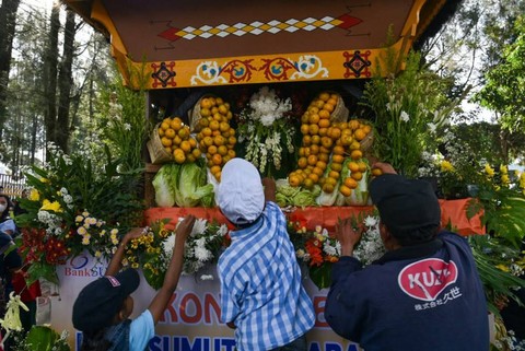 Peserta mengikuti pawai Festival Bunga dan Buah di Berastagi, Karo, Sumatera Utara, Jumat (7/7/2023). Foto: Fransisco Carolio/ANTARA FOTO