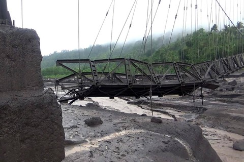 Kondisi Jembatan Gantung Kali Regoyo yang putus diterjang banjir lahar hujan di Sumber Wuluh, Lumajang, Jawa Timur, Jumat (7/7/2023). Foto: Rohcmad/Antara Foto